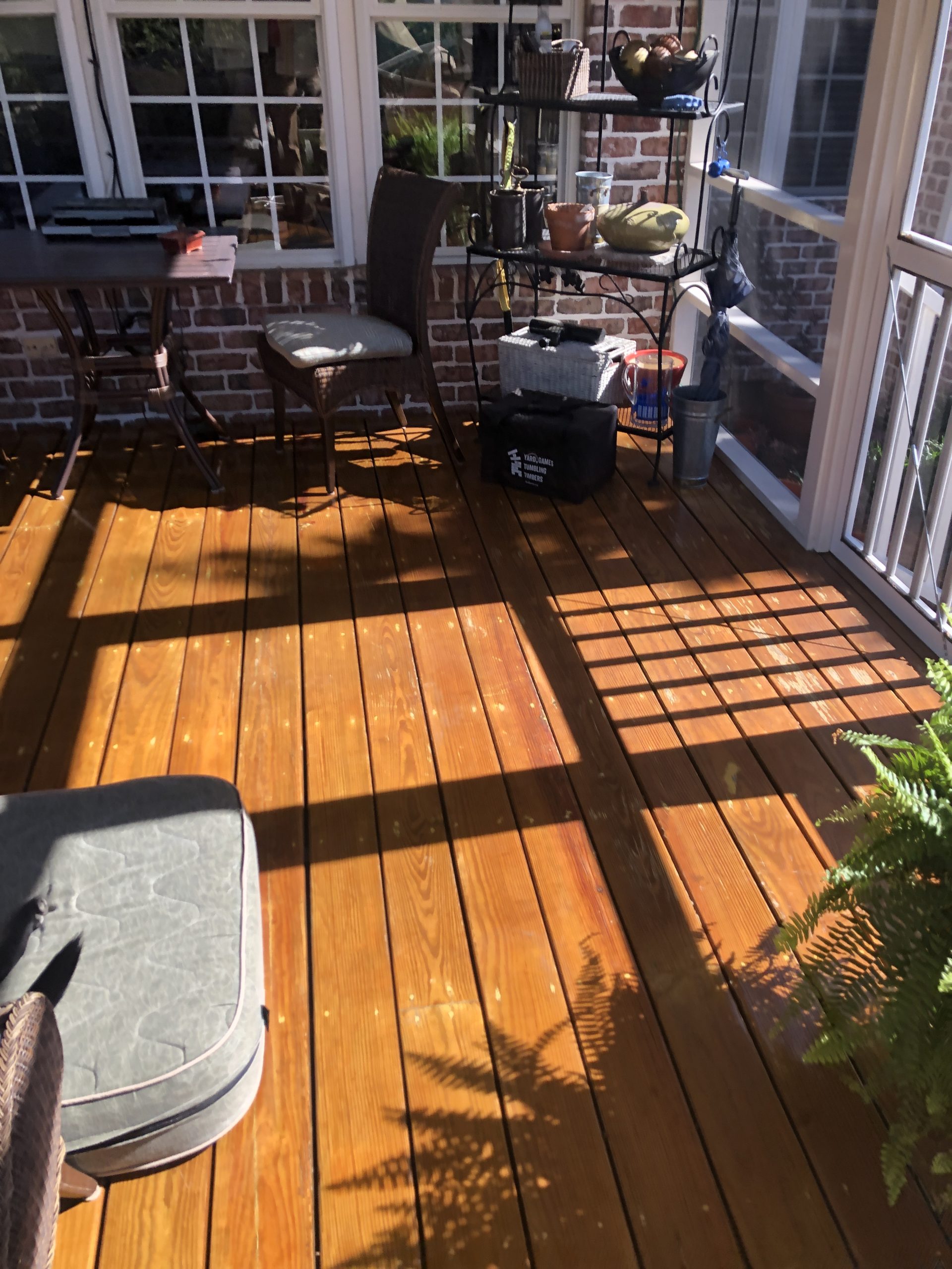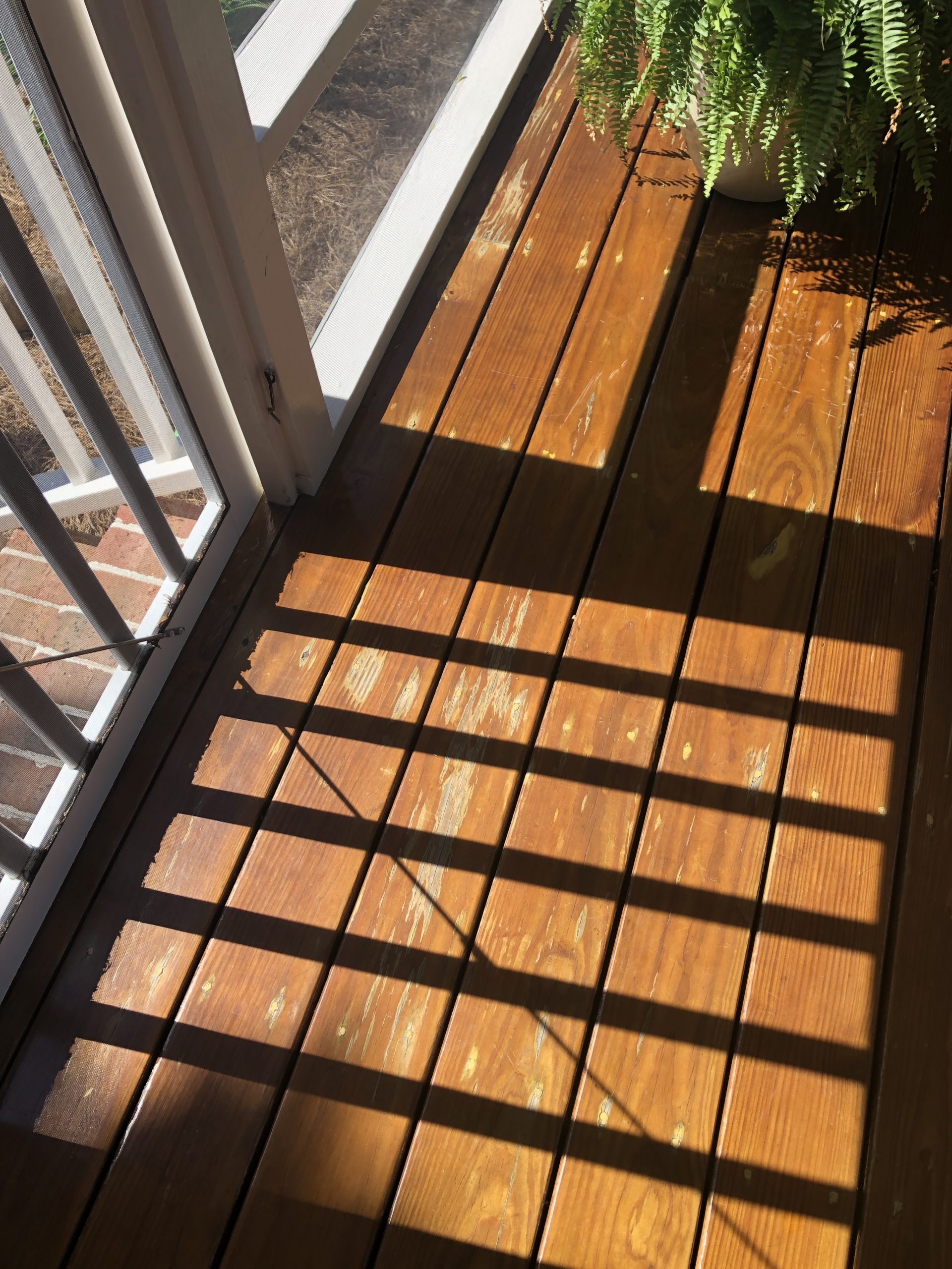 I have a customer who has a screened-in deck floor that is sealed with what looks like Marine Spar Varnish. It is a glossy sheen. Their are 3-4 areas that are lifting due to the limited sun exposure, and not keeping it maintained every year. Overall, its in great shape, but the varnish and stain will have to be removed down to the wood, and then re-stained again in order for the floor to look consistent. They want the gloss varnish look again. I’ve never recommended any kind of varnish on a deck floor. What are your thoughts since it is a screened porch?