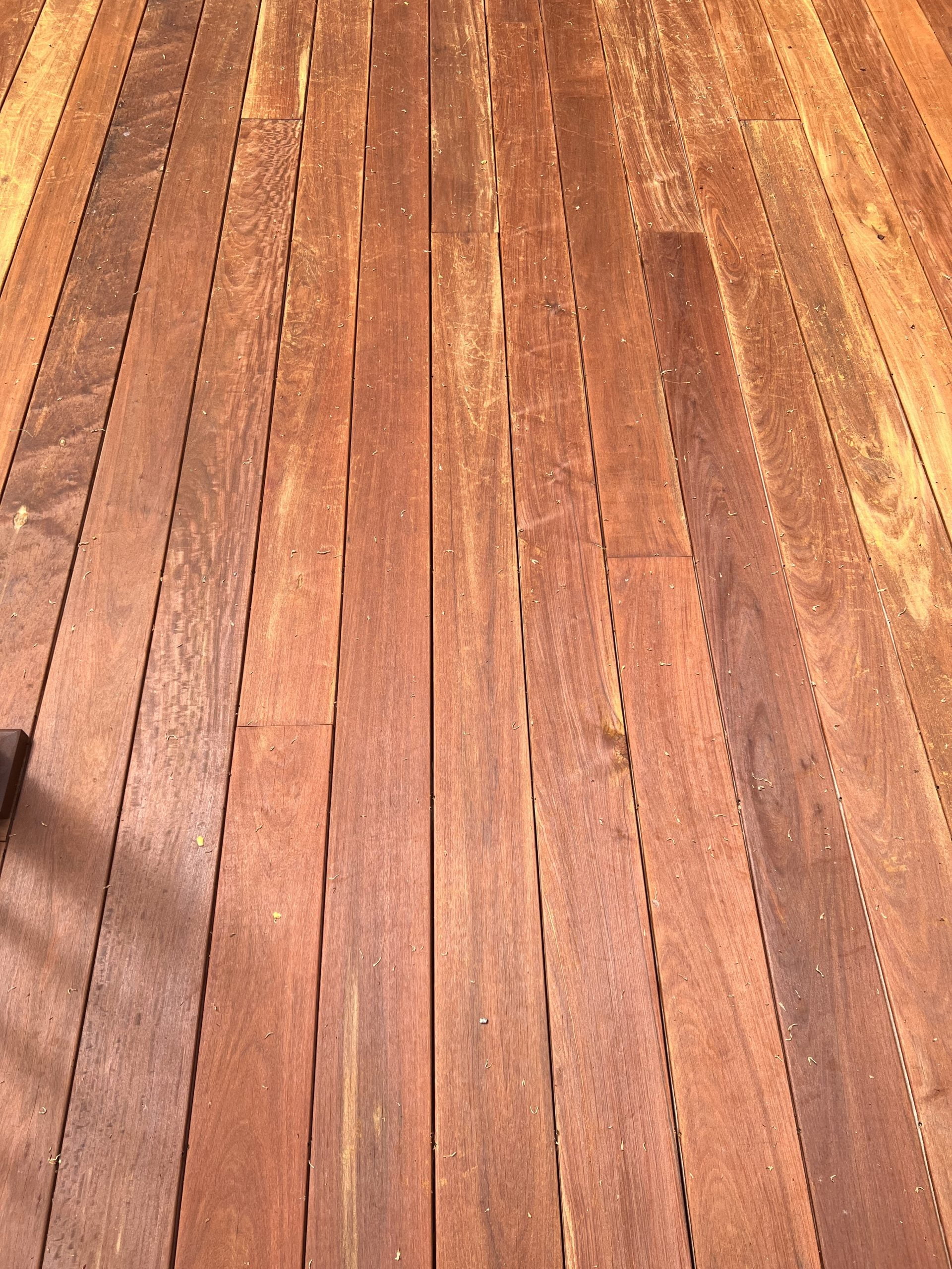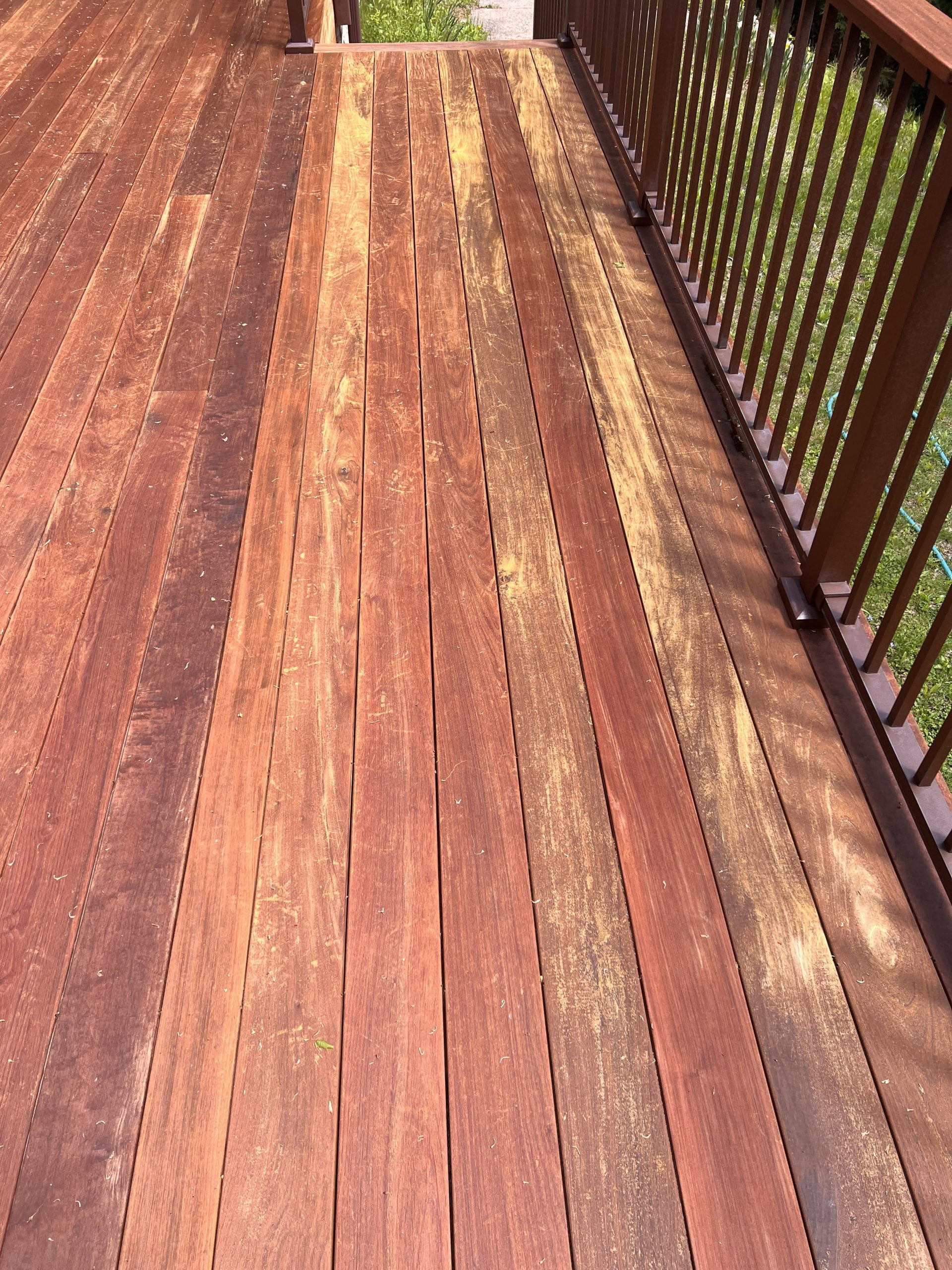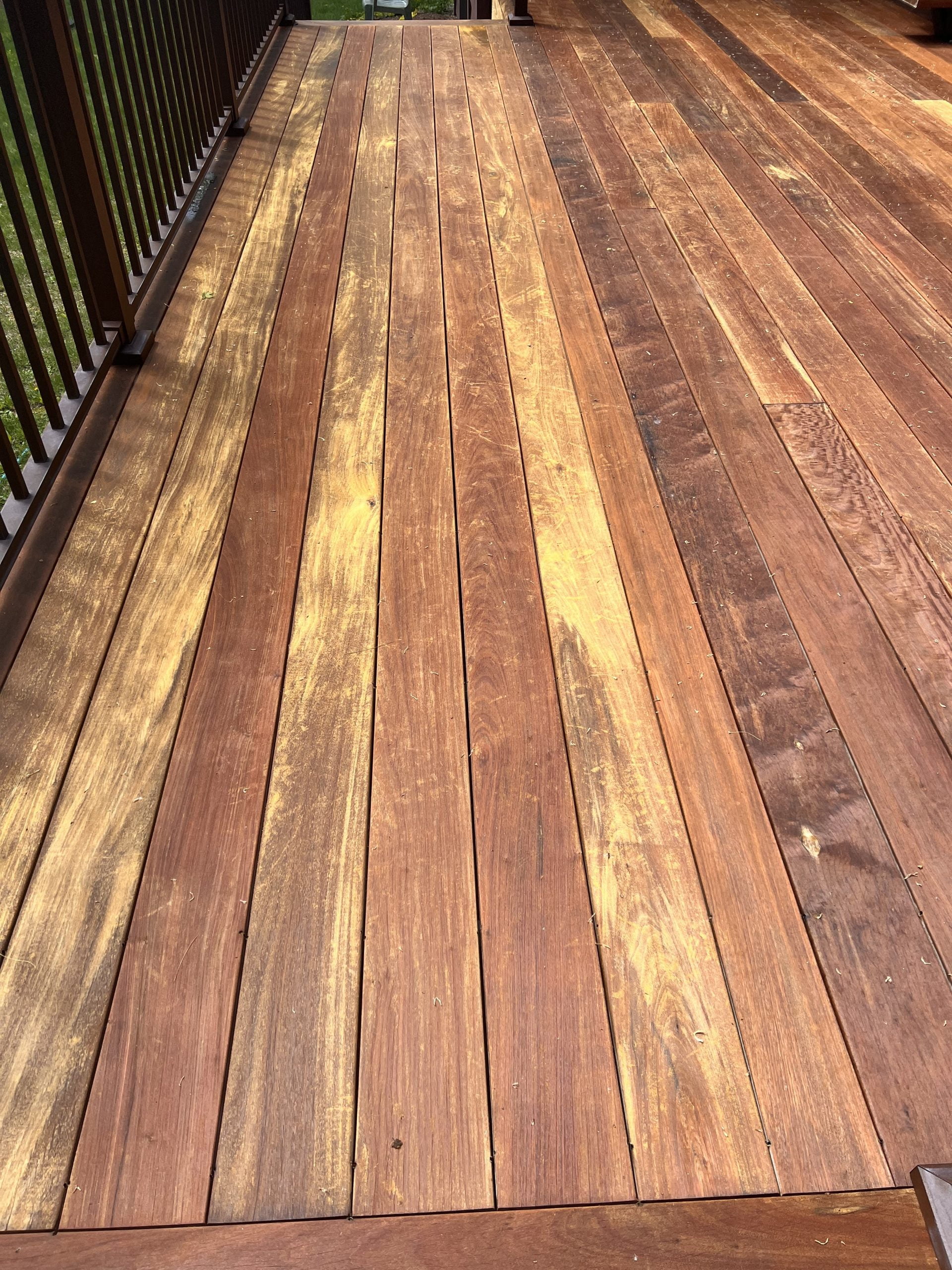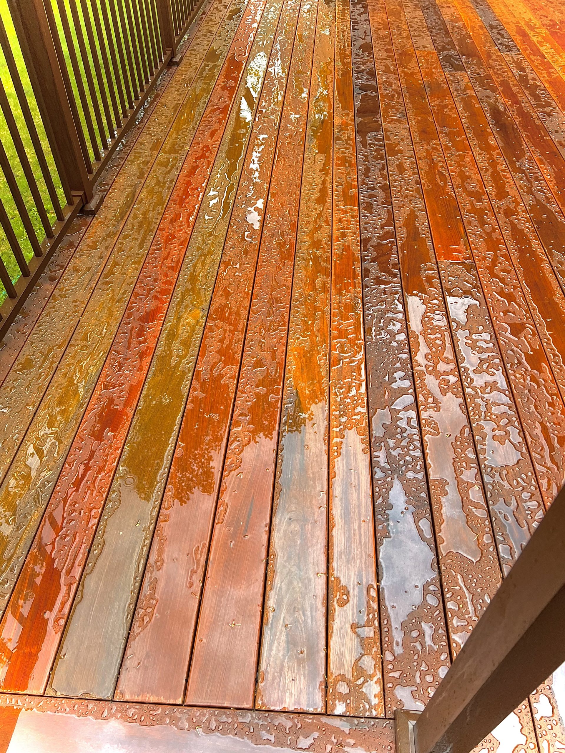 IPE deck, installed 12 months ago. I let it weather for 12 months. Boards were a pretty even and consistent gray, but beautiful IPE color when wet. A week ago I used RAD 1&2. Gray was then a bit lighter, but still pretty even and consistent. Feel like I did a really good job getting all of the cleaner and brightened off. I let that dry for 2 days. Looked good. Applied AC Amber. Looked great for 4 days.