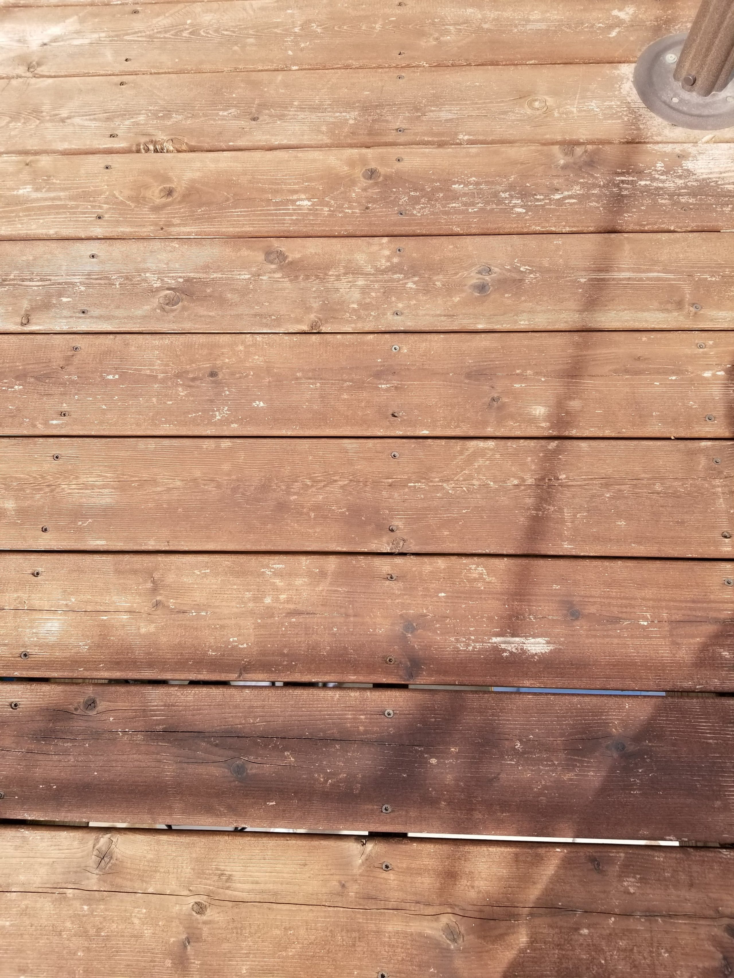 Hello. I have a 25+ year old redwood deck, that is in pretty good condition but needed to replace some boards. The installed replacement boards are of pressure treated wood rather than redwood (not my choice, but was what my husband was advised to do.) We have power washed the deck so far and plan to strip and brighten the deck before staining it. I have a couple of questions I am hoping you can advise on: