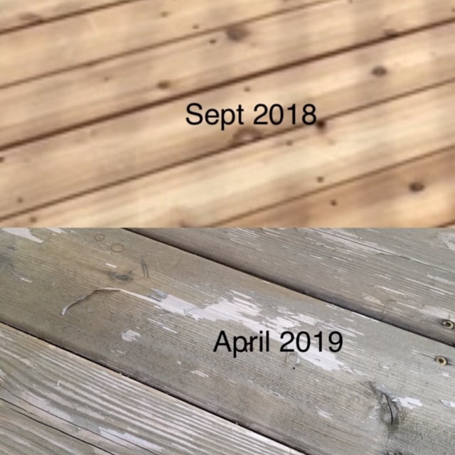 Replaced not one but 3 decks. All new wood. One winter with Behr waterproof semi transparent and the wood has so many cracks stain peeling etc. Wood is not waterproofed. Thousands spent and 100 for stain was suppose to protect. Terrible product Don’t use