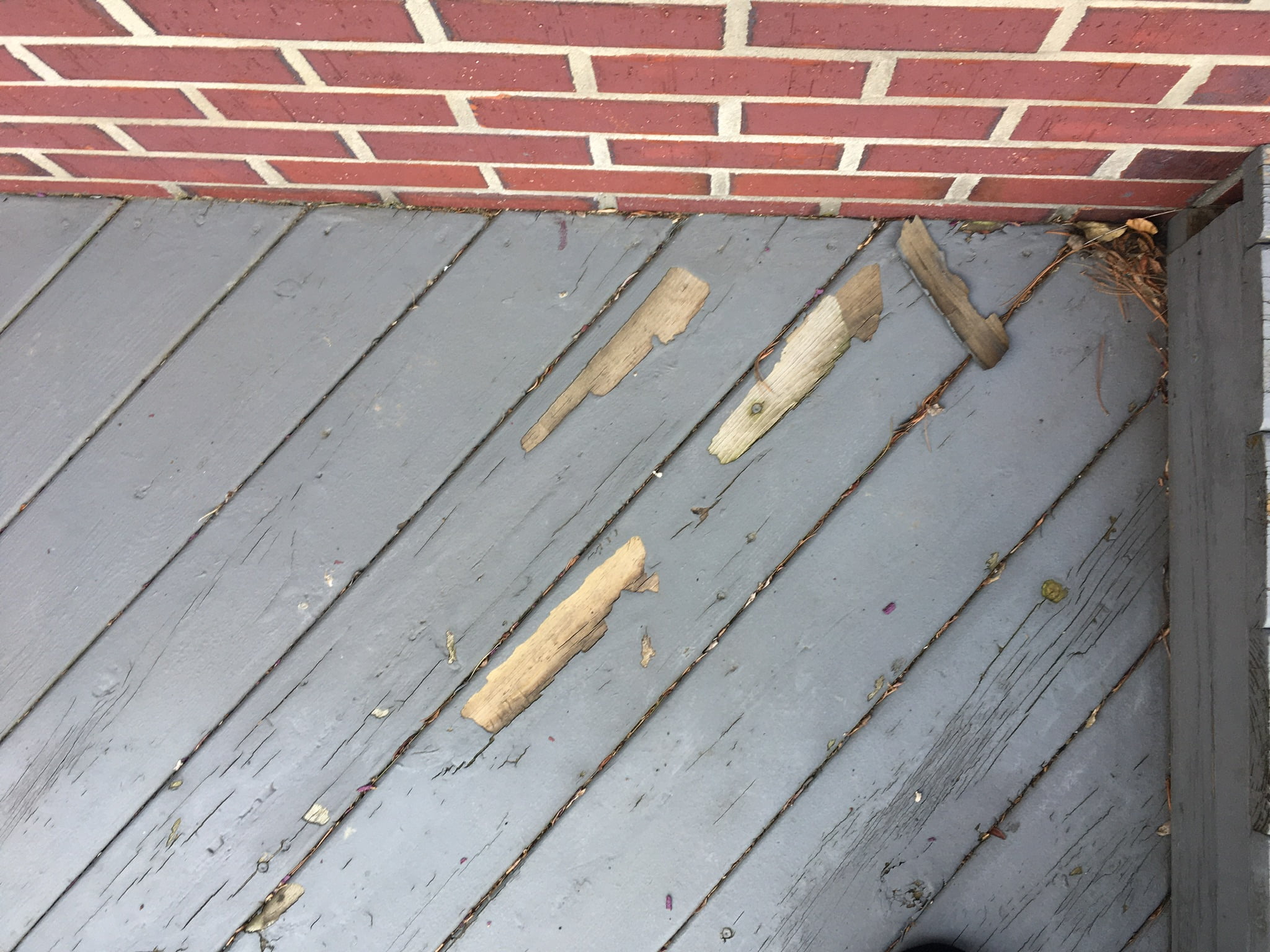 The paint, deckover , has cracked, and the wood, is rotting under the Deckover paint.