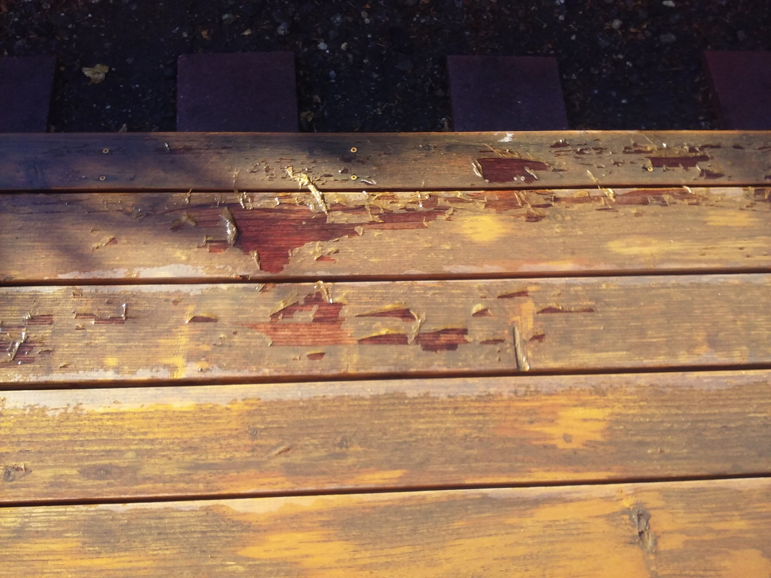 >> I used this product (on a previously non-stained pressure treated deck) as per label directions back in 2008 or 2009 (can't recall without looking up receipts) and it was peeling the following season on horizontals but 90% good on verticals except for those facing predominant wind side of weather which were down to about 40-50%. 3 summers later I stripped and sanded remaining stain (wearing a mask as the potential for lead dust was indicated on label) to get back to original wood. While it's best to not sand these stains or pressure treated wood, strippers alone didn't do the job. Once back to the original wood (and the deck looking amazing!) a brightener was used. Ready to stain again.