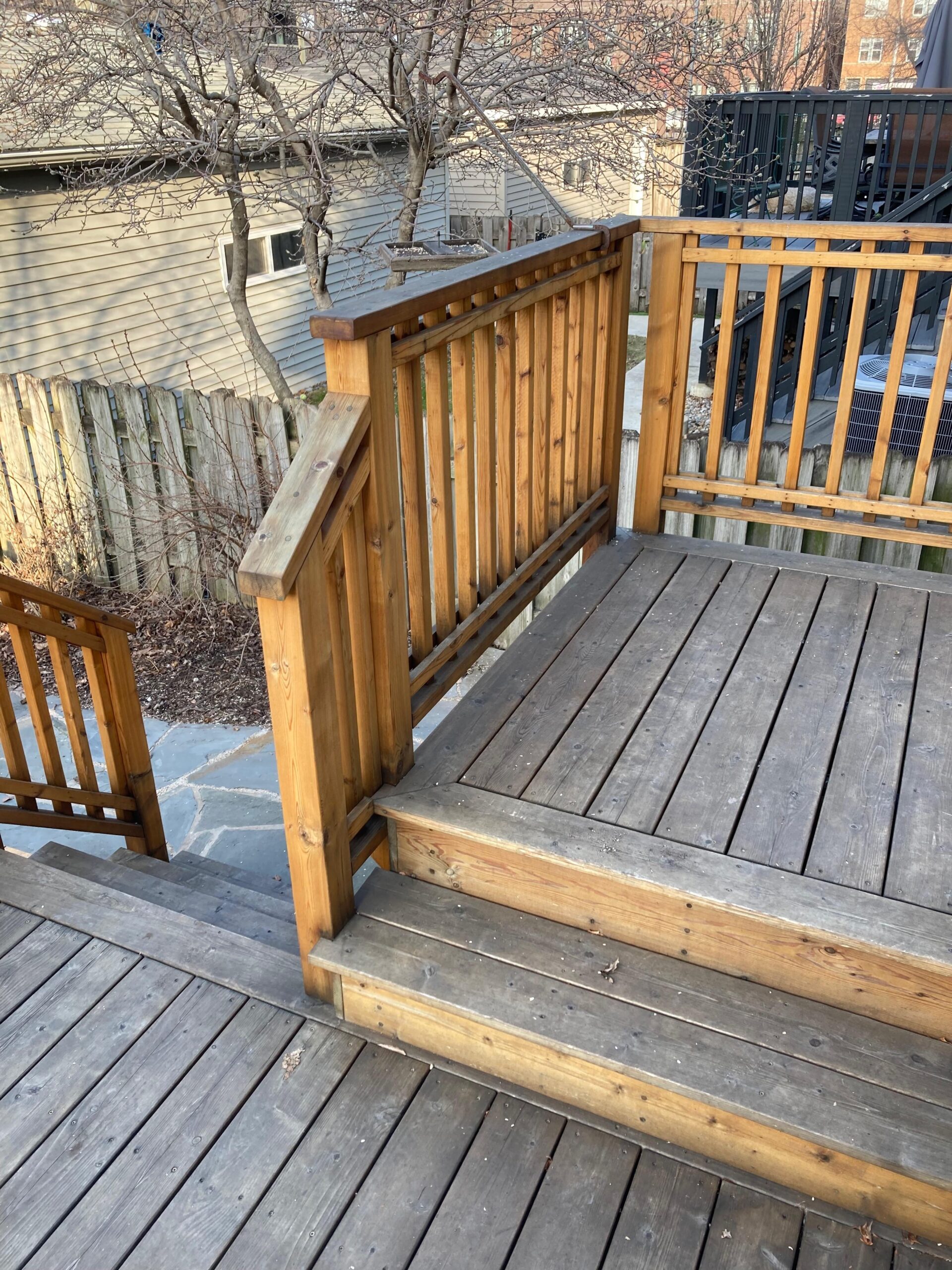 Picture #2 – is the deck from 3 years ago after using Deck Wise; it works and looks ok but the wood has really darkened and I would prefer a higher sheen.