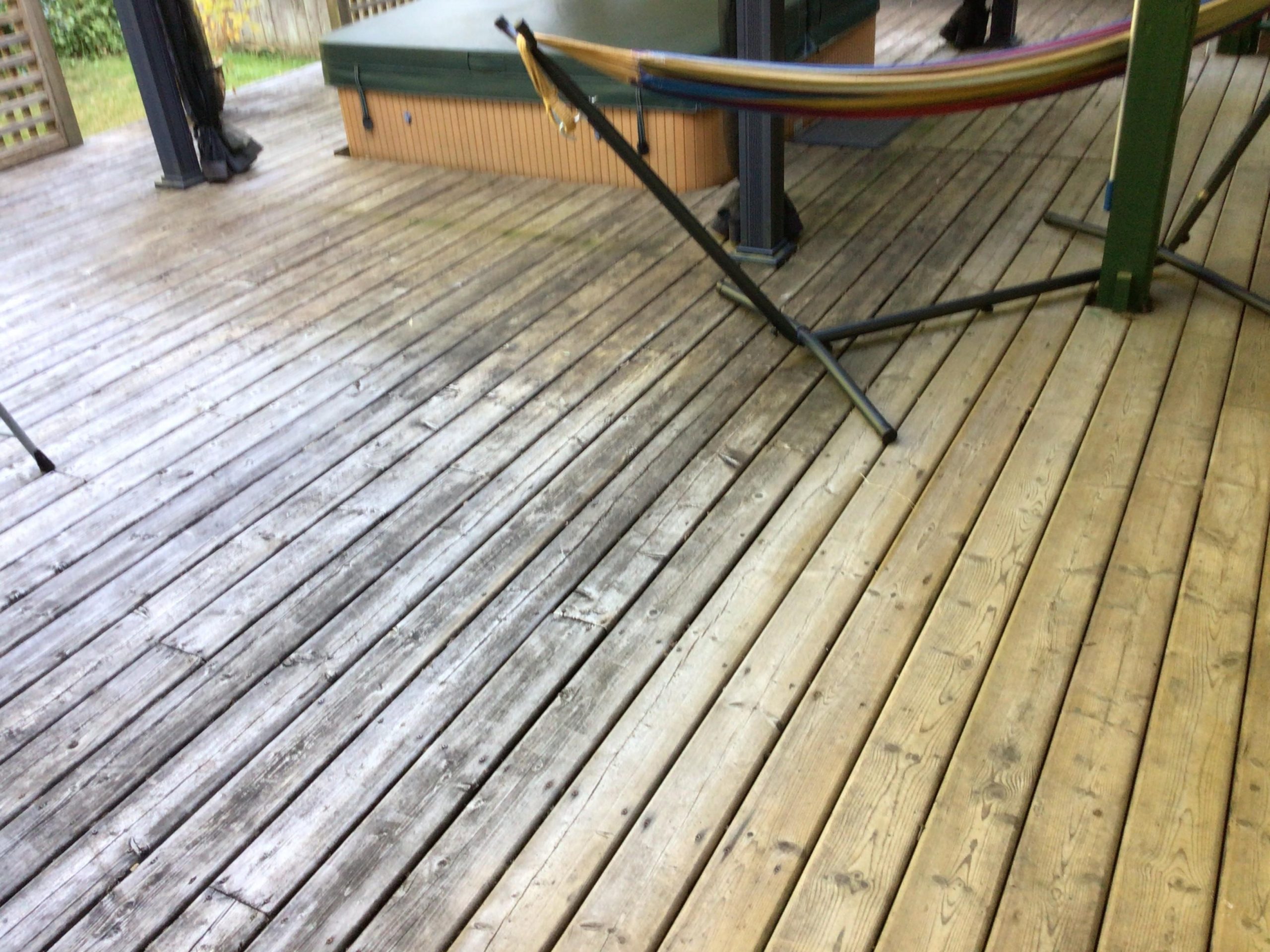 We moved in here a year ago. This is an old treated wood deck that has always been left untouched. Could be 14 to 23 years old.