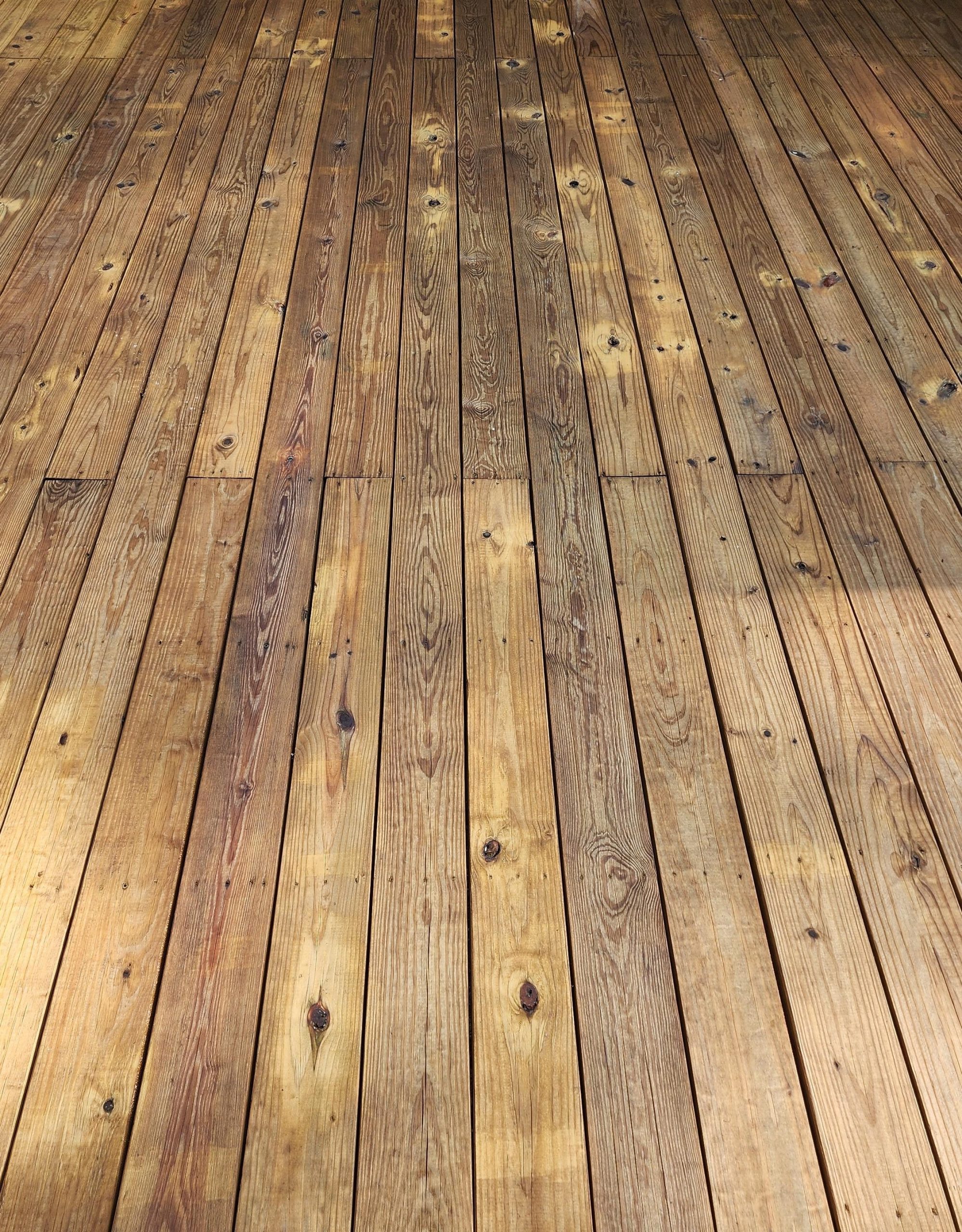 The deck flooring would need a good strip and brighten. Use the RAD products. For stain, try Armstrong Clark or TWP 1500 Series.