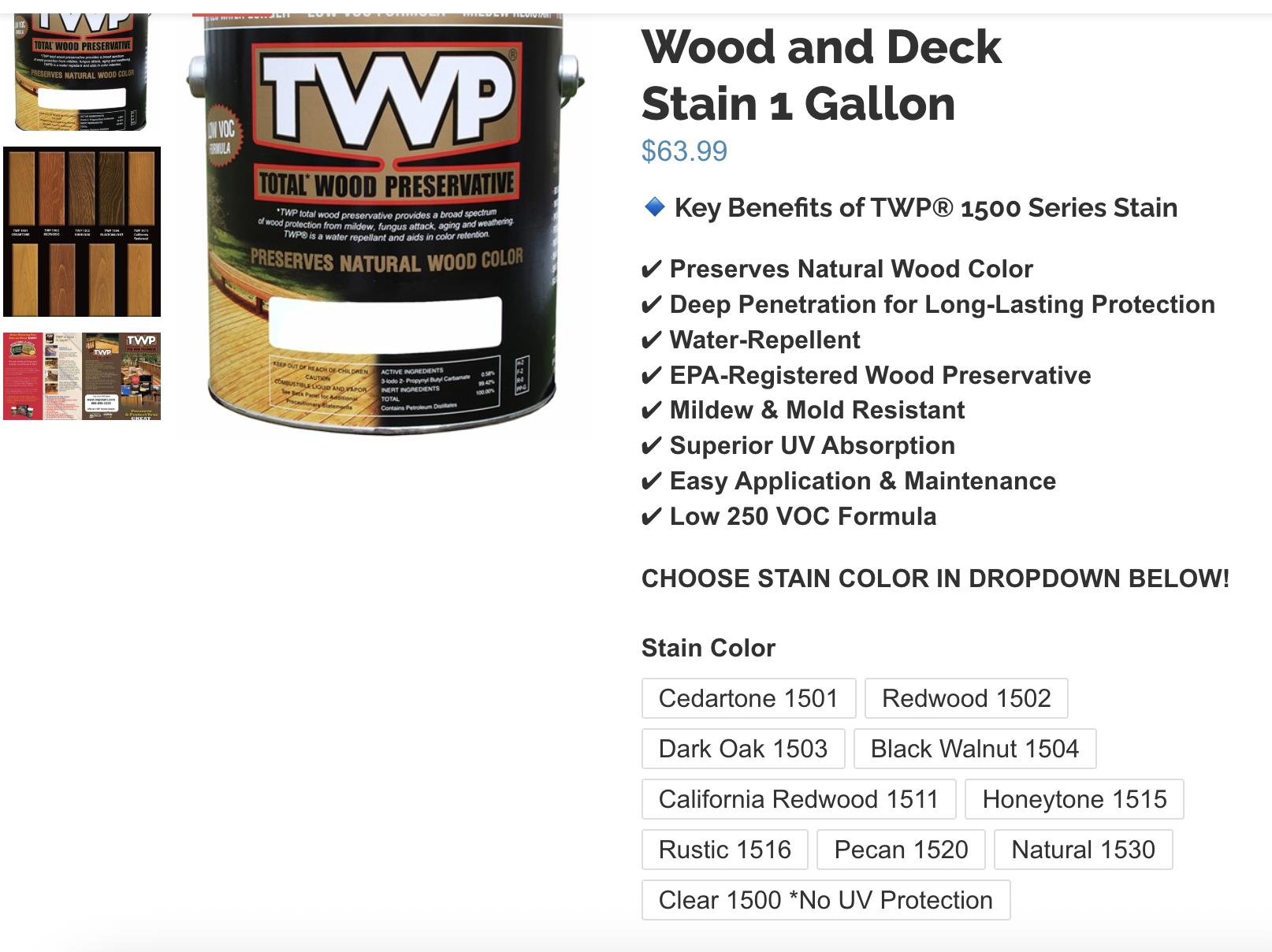 - Scott’s Pro Tips: My current go-to semi-transparent deck stain for Michigan. Unlike TWP’s 100 Series stain, the TWP 1500 Series Stain is available in all 50 states and features an EPA-registered wood preservative.