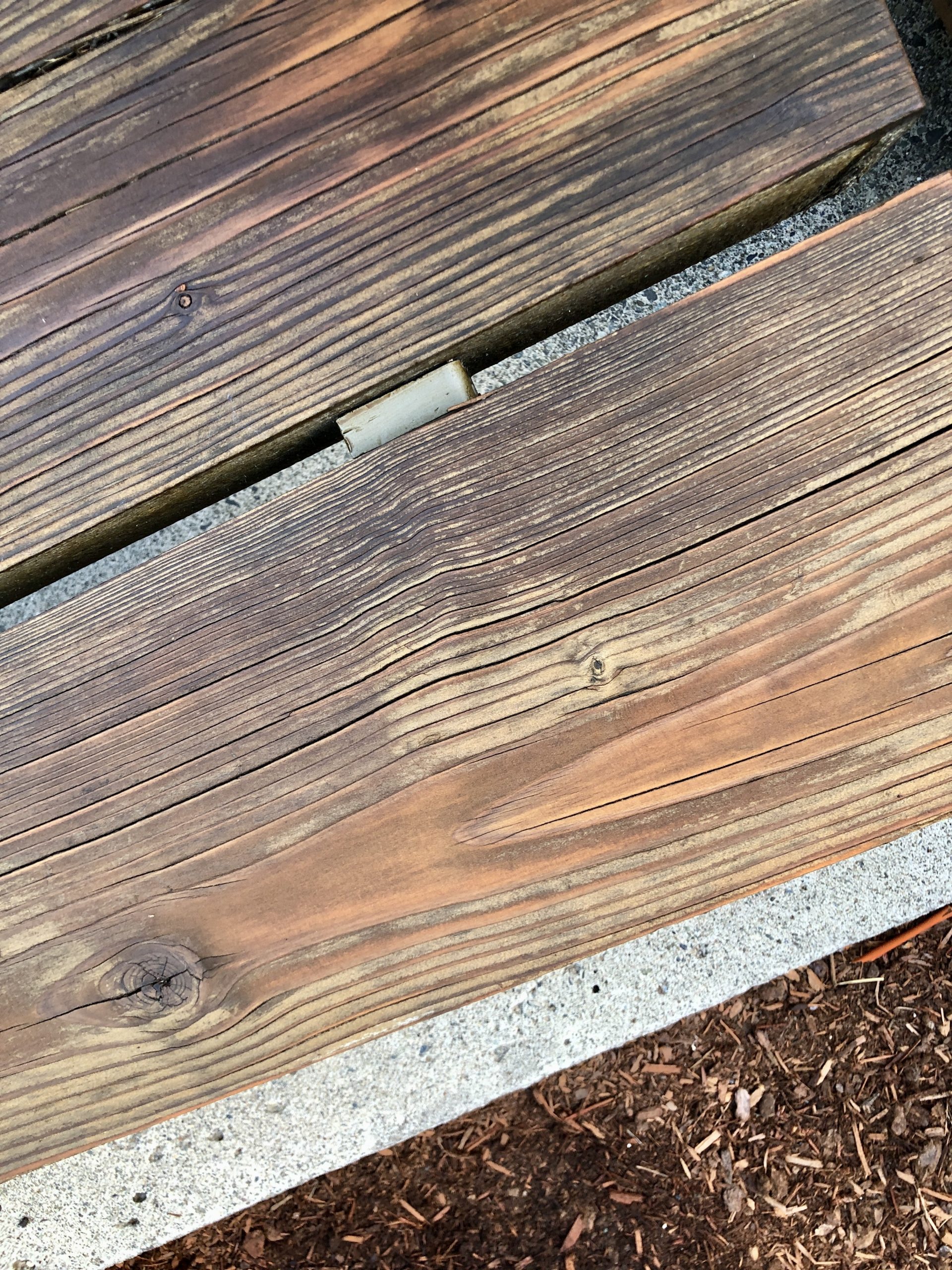 Darkening of the stain had occurred where the stain was still attached to the wood. Mostly due to dirt and mold.