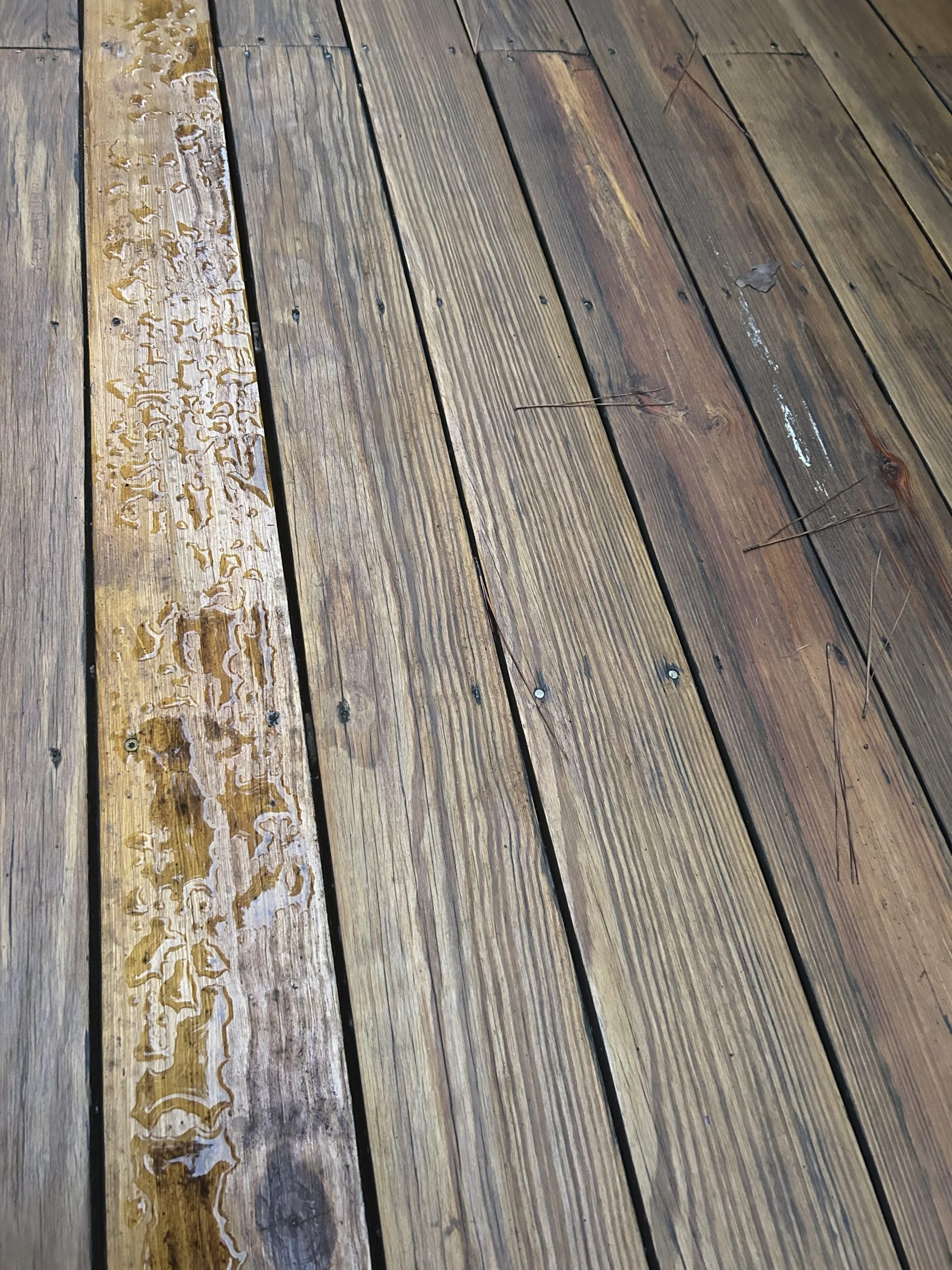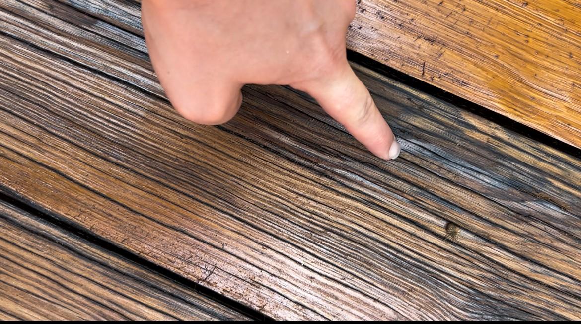 I’ve tried to take pictures that really show, but they don’t seem to represent the reality. One of these is a screenshot from a video that I took of me pressing into one of the rotten boards. There are multiple boards like the rotten one. Very soft and you can poke holes through. This work was done 5 weeks ago.