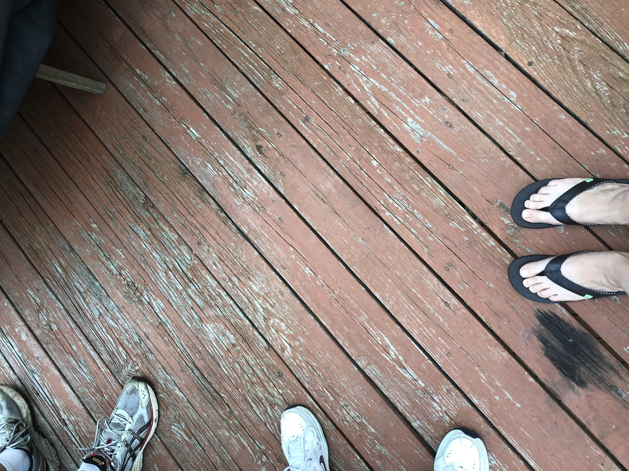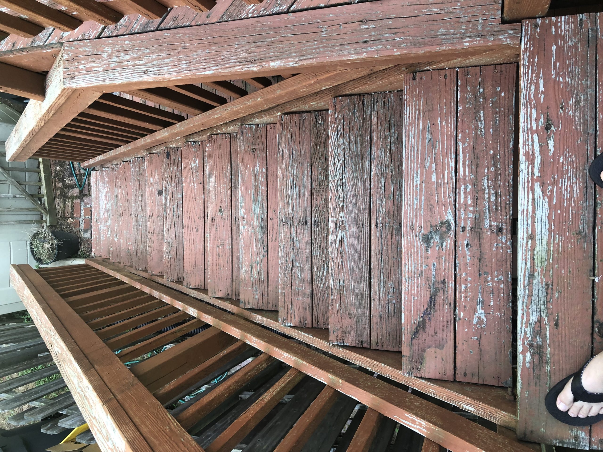 Unlike a deck the porch is covered with pine tongue and groove planking that is mostly in good condition, a few boards will need to be replaced.