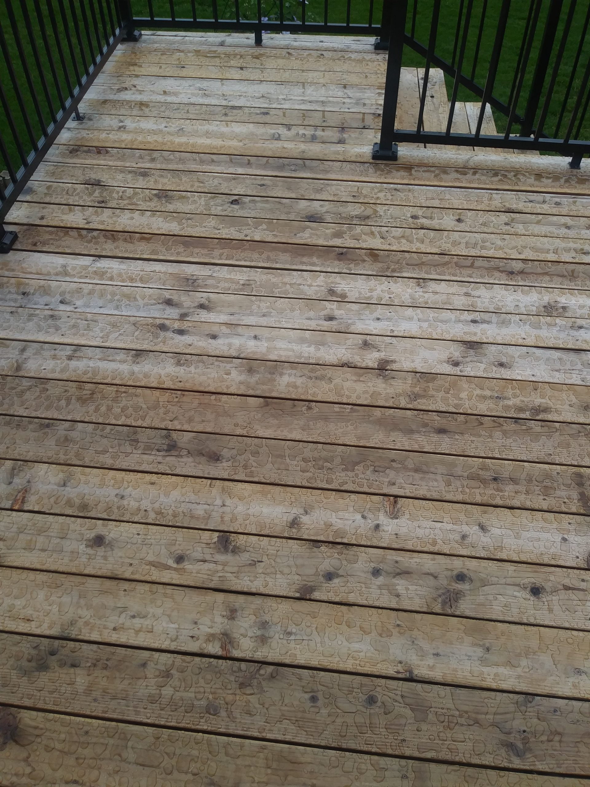 I have a 10 x 12 redwood deck built last fall. Two weeks ago, before finding your product, I ended up at a big box store and was talked into using Olympic Waterguard Clear wood sealer. I wanted less color but a “wet wood” look. I was told this product would be what I wanted. Since it was water clean-up and no where on the product did it mention it was an Acrylic product, I gave it a try.