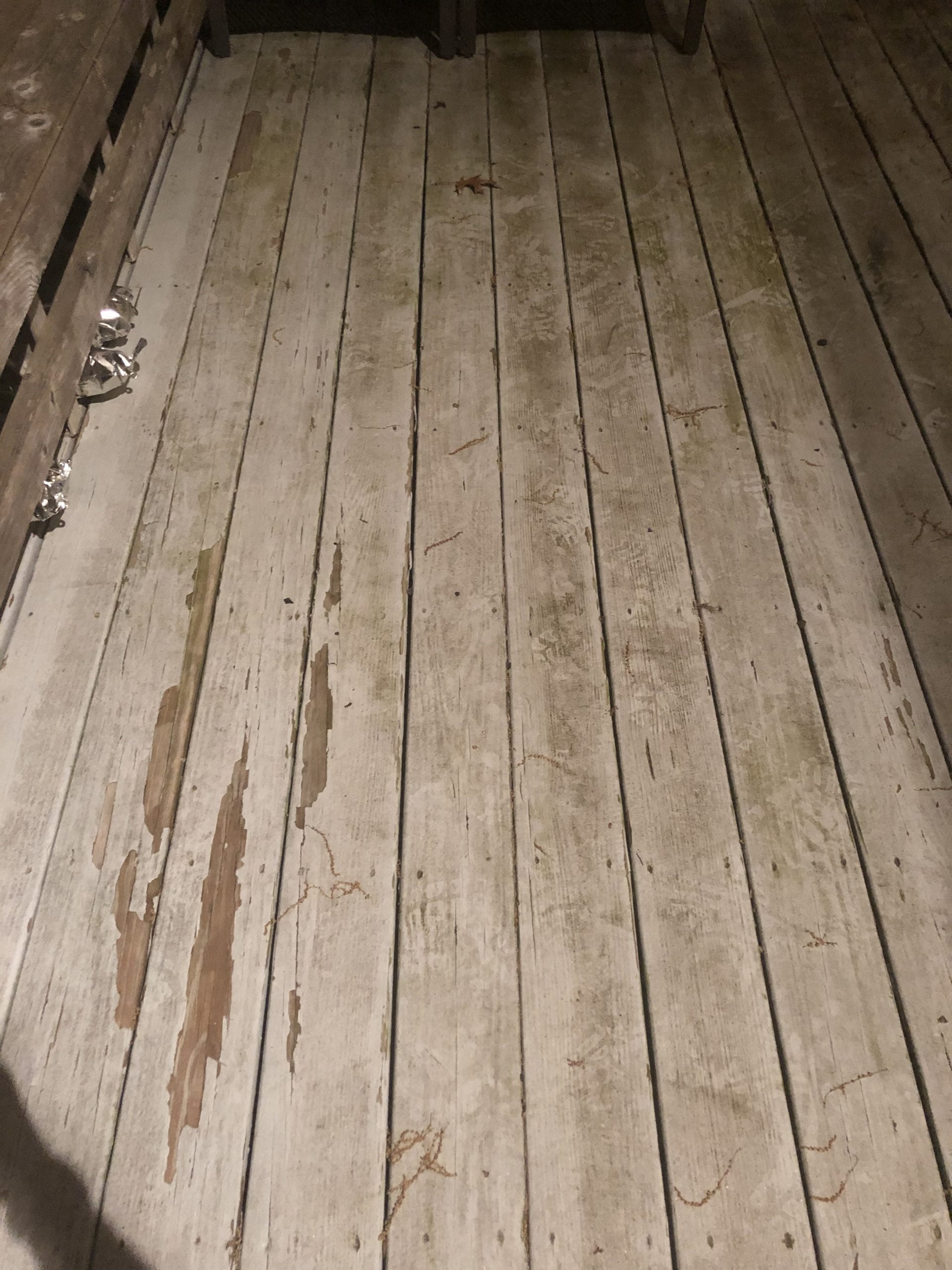 I have this deck that barley gets any sun at all. I finished it with something like a tough coat. As you can see it is now peeling and has mold and mildew. I want to either clean it or strip it and clean it. In the end I would like to go with a stain that won’t peel and will help with the mold and mildew. Any suggestions on how I can make this visually pleasing, please advise.