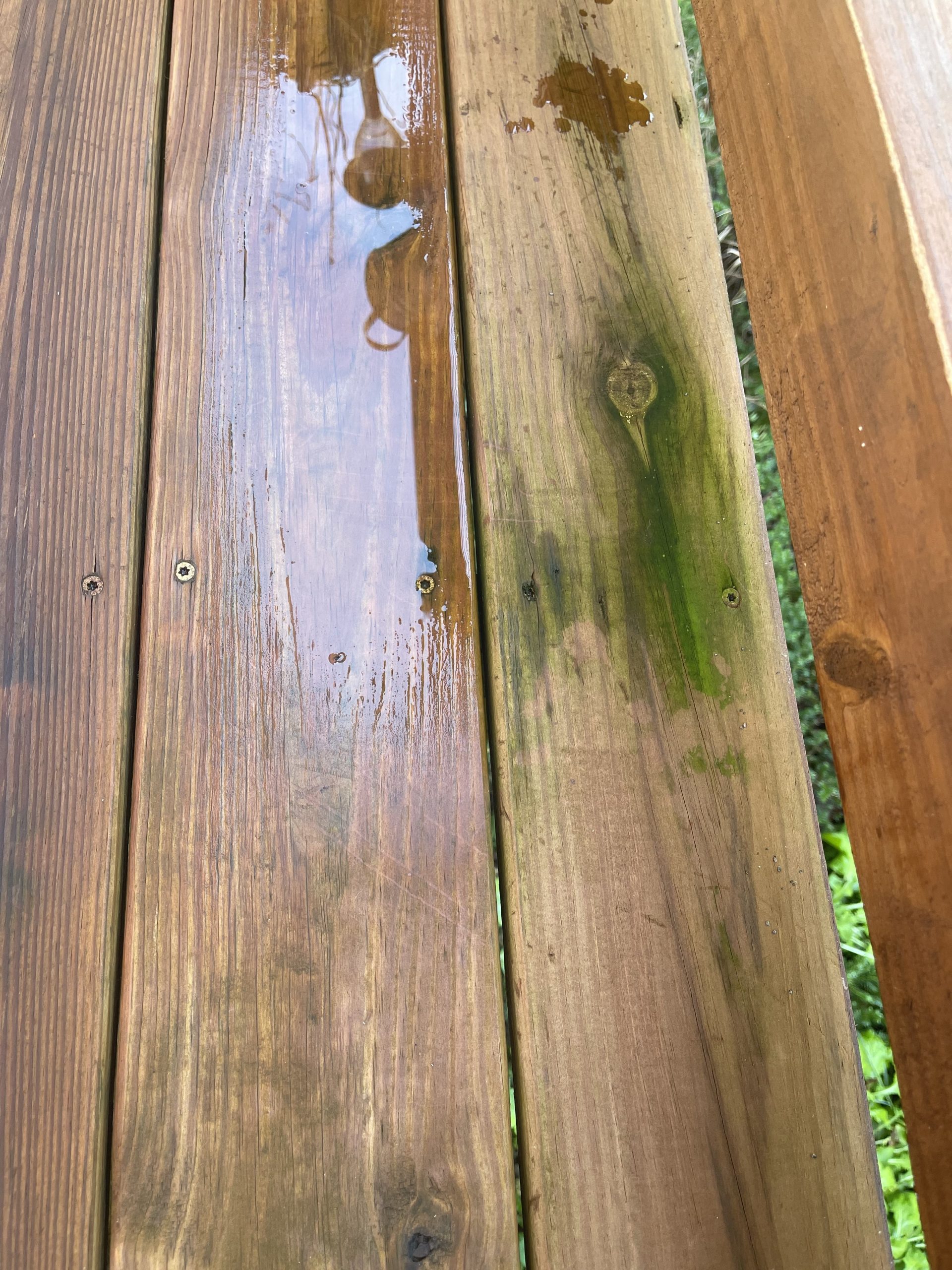 After a year, areas underneath furniture and a deck storage box still look great and still bead water. Shaded areas look fair and no longer bead. Sunny areas have turned dark and no longer bead. It is these sunny areas where the thickest layer of “mung” is found.