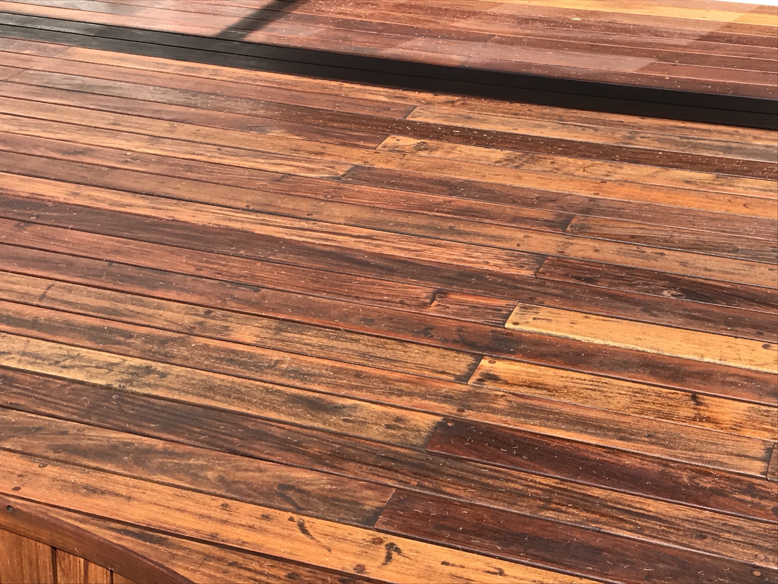Hi – this is my merbau deck that was put down 10 months ago. It has gone black apart from area that were covered with furniture? Any advice on best way to deal with this? Thank you Jackie. ps please ignore one picture there it’s my fence- sorry can’t work our how to delete it now!