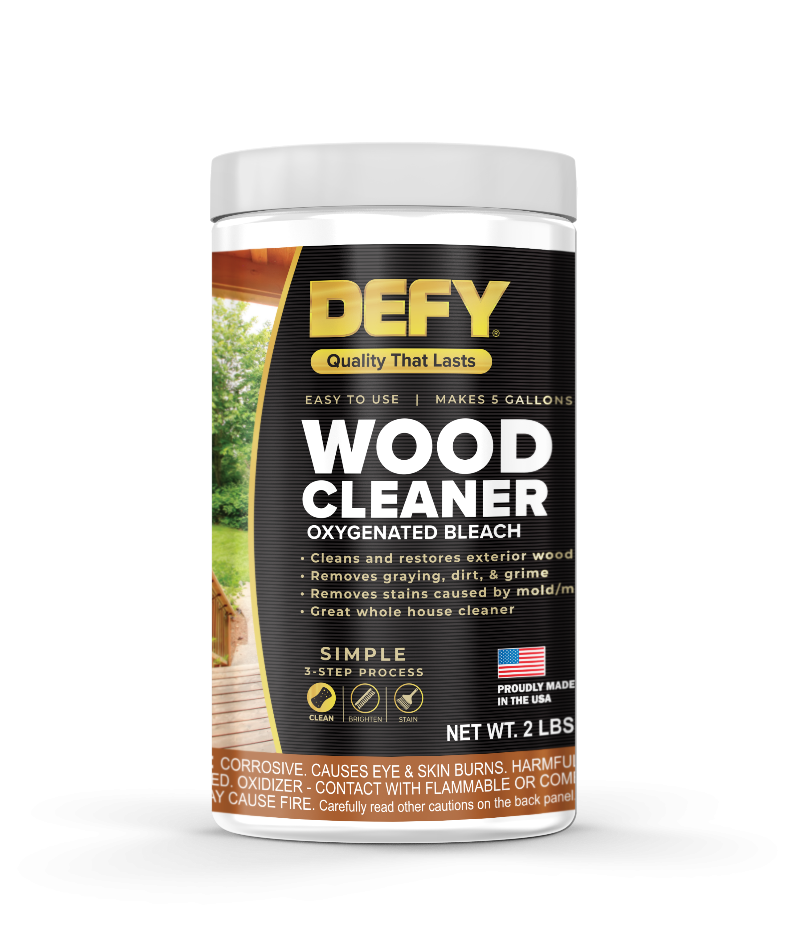 DEFY Wood Deck Cleaner is a highly effective, oxygen bleach-powered cleaning solution that restores the natural beauty of exterior wood surfaces by removing dirt, mold, mildew, algae, and weathered graying. Unlike chlorine bleach-based deck cleaners, which can damage wood fibers and surrounding vegetation, DEFY Wood Cleaner is biodegradable, eco-friendly, and safe for plants, pets, and outdoor surfaces.