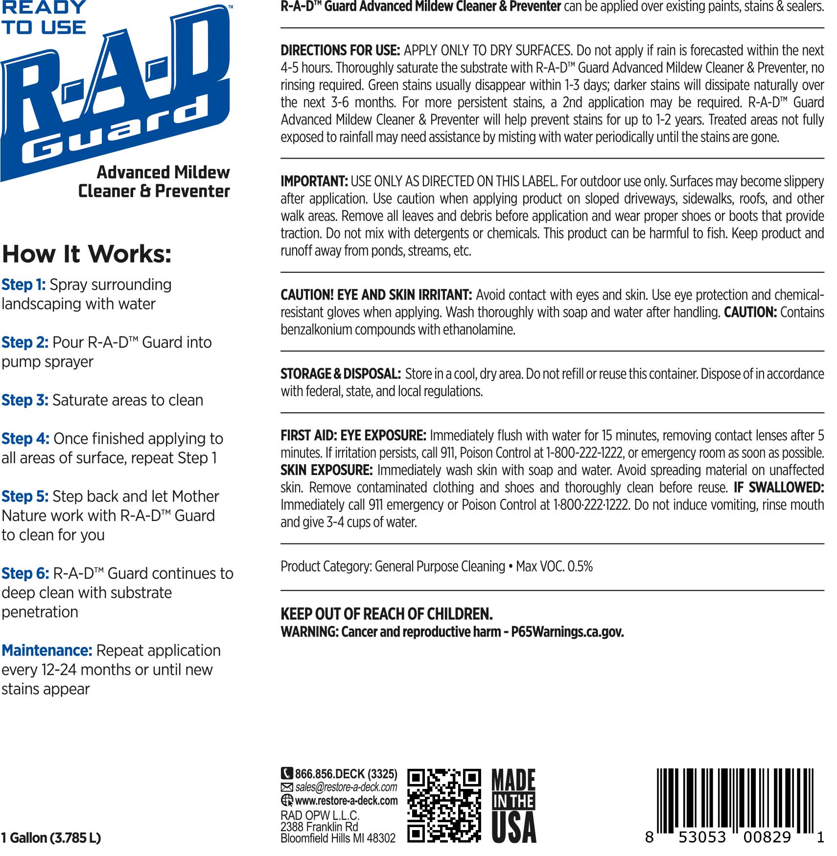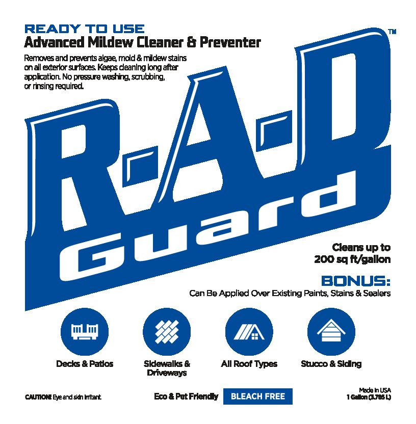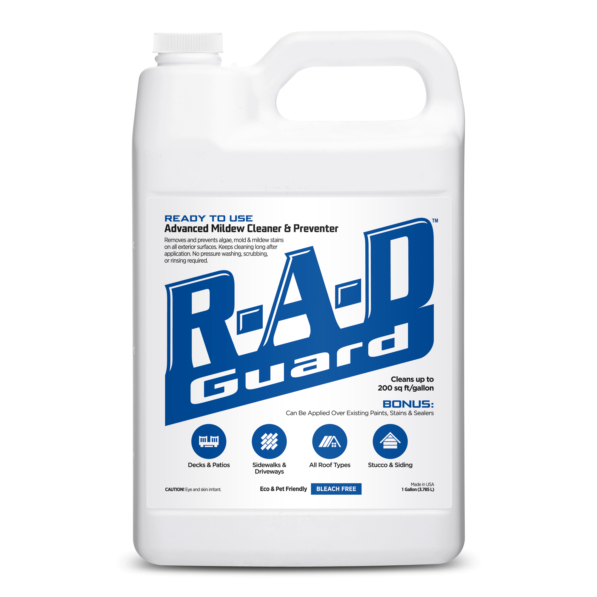 R-A-D™ Guard RTU (Ready-To-Use) is an eco-safe, no-rinse cleaner and mildew/algae preventative designed to remove and prevent mold, mildew, and algae stains on exterior surfaces. Unlike traditional cleaners, R-A-D™ Guard works over time, eliminating stains without pressure washing, scrubbing, or rinsing. This powerful bleach-free, acid-free formula is safe for existing paints, stains, and sealers, making it the perfect maintenance solution for wood decks, siding, patios, roofs, and more.