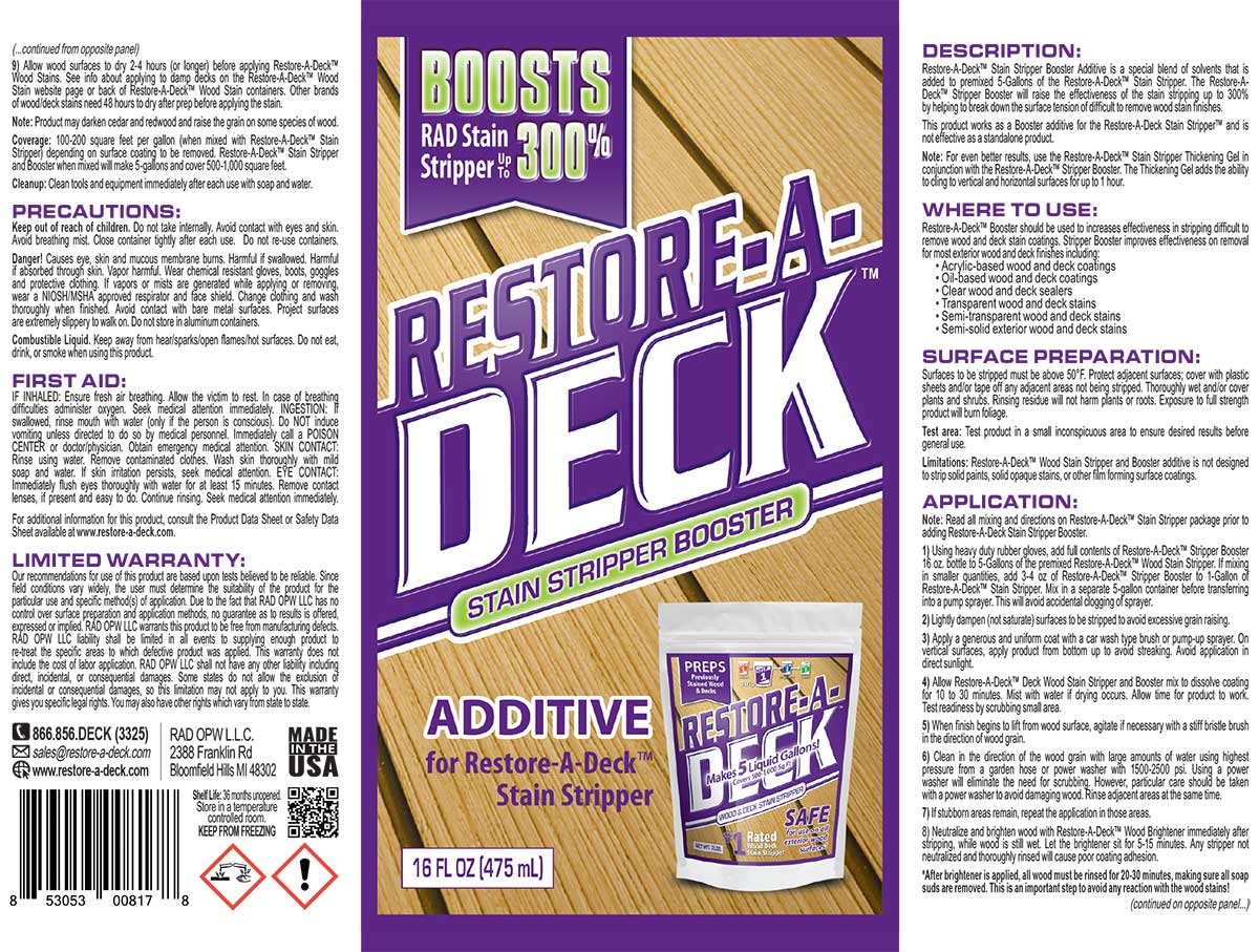 Restore-A-Deck Stain Stripper Booster Additive is a powerful solvent blend designed to increase the effectiveness of the Restore-A-Deck Stain Stripper by up to 300%. This additive helps break down surface tension, making it easier to strip difficult-to-remove wood stain finishes, including acrylic-based coatings, oil-based stains, and semi-transparent finishes.