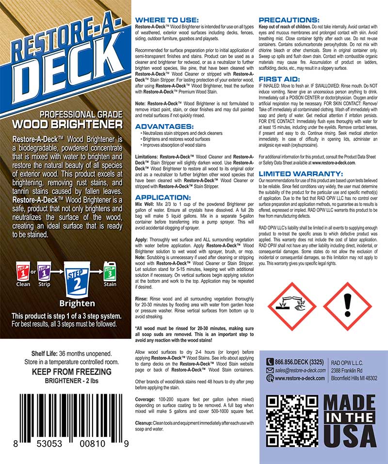Restore-A-Deck Wood Brightener is a biodegradable, eco-friendly powdered concentrate designed to brighten, restore, and neutralize exterior wood surfaces after cleaning or stripping. This Step 2 product in the Restore-A-Deck system enhances wood color, removes rust and tannin stains, and prepares wood for optimal stain absorption.