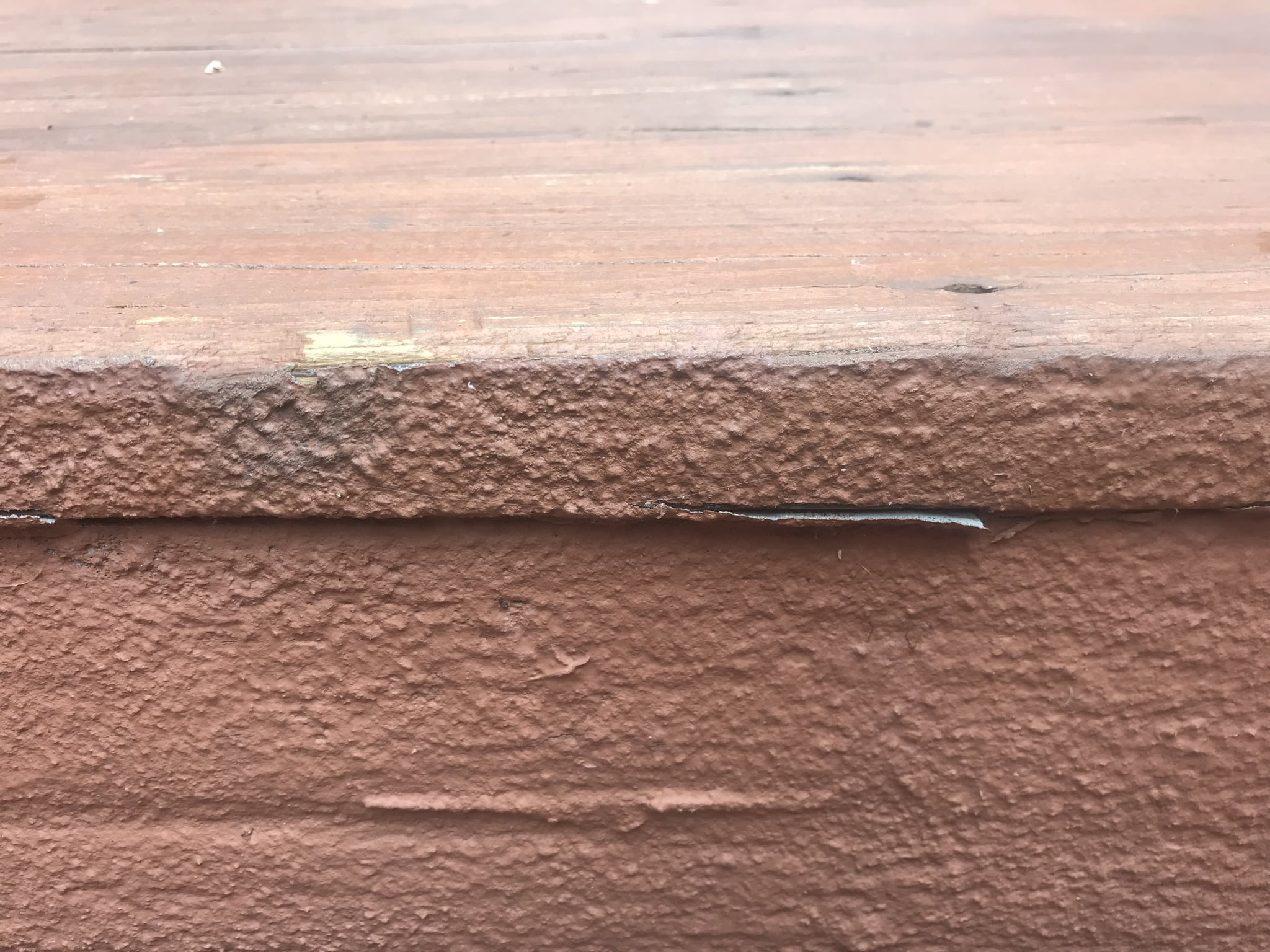 Synta (Rust-Oleum) Restore showed some wearing in the high-traffic areas and between the decking boards. The (Rust-Oleum) Restore did not seem to adhere to the boards as the finish curled up here.