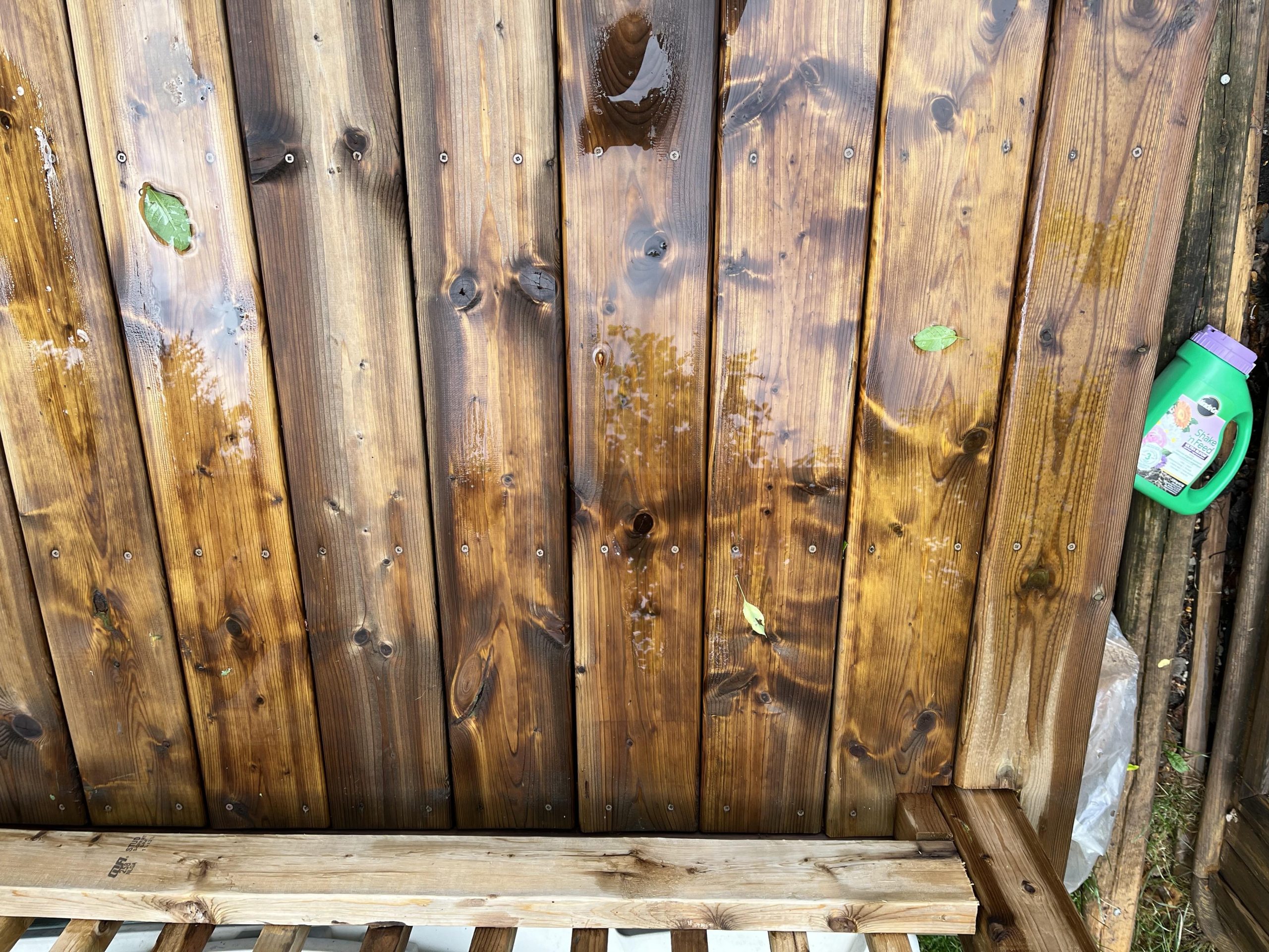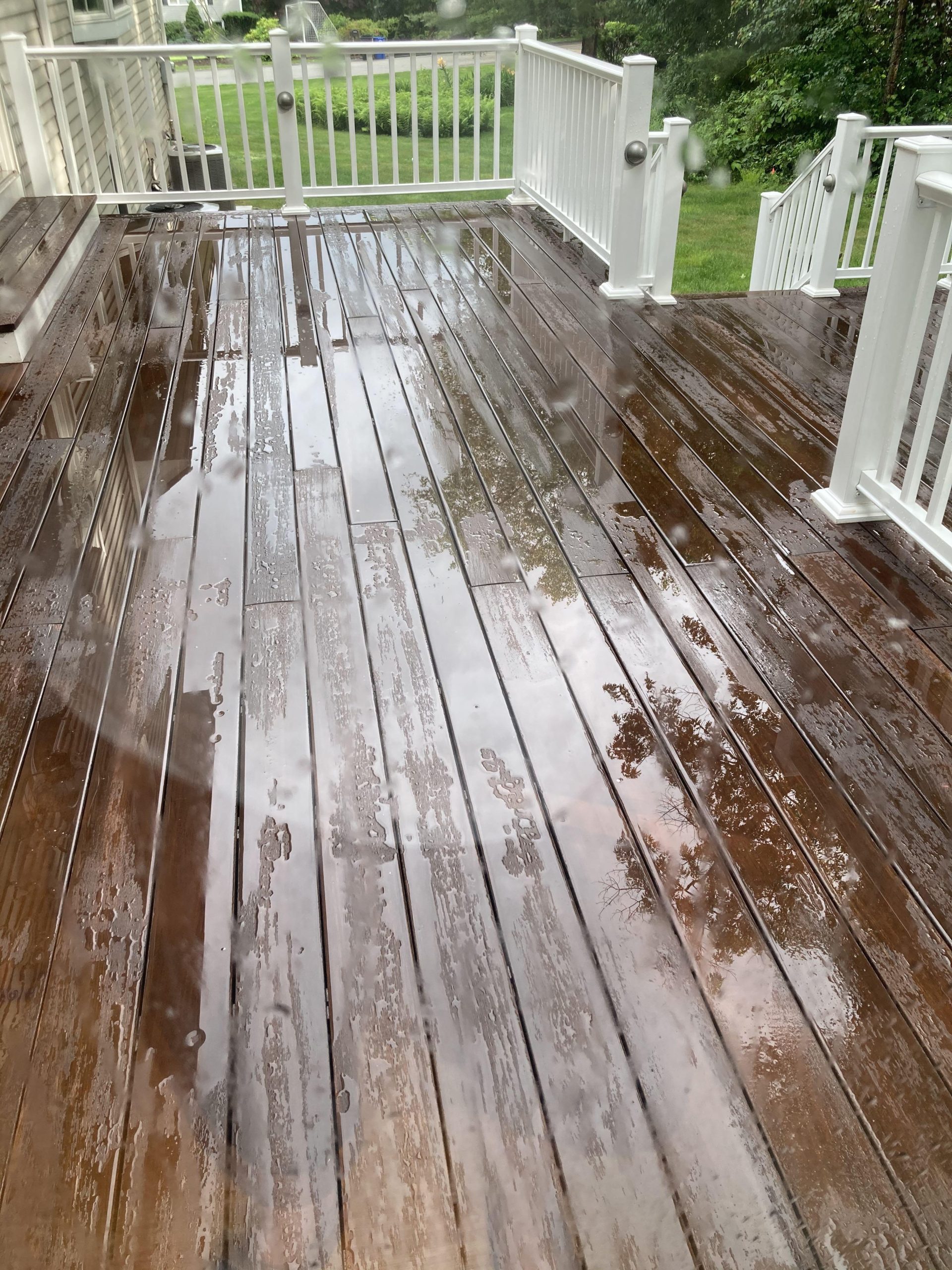Why/how did the previous stain fail? after 5 years of not reapplying, I have applied 2 coats of below stain last year after clean and light sanding. It stops bead up water after couples of months. Also there are some small cracks on lot of boards as attached photos (crack, rain just after stain, rain now)