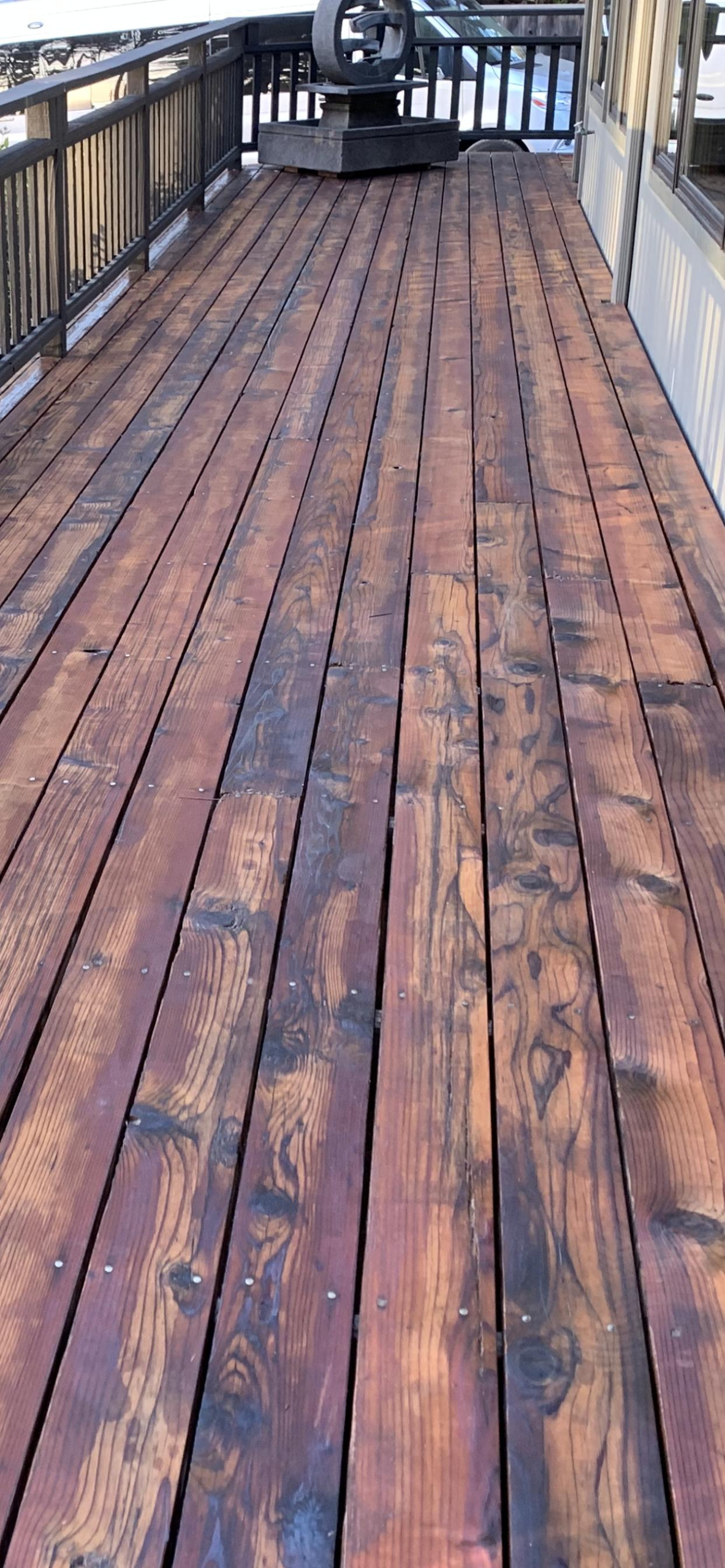 It is a larger deck—facing east(on east side of house) = 66’long by 9′ wide; facing north/on north side of house= 39′ x 15′; and on northeast side of house =18’6′.