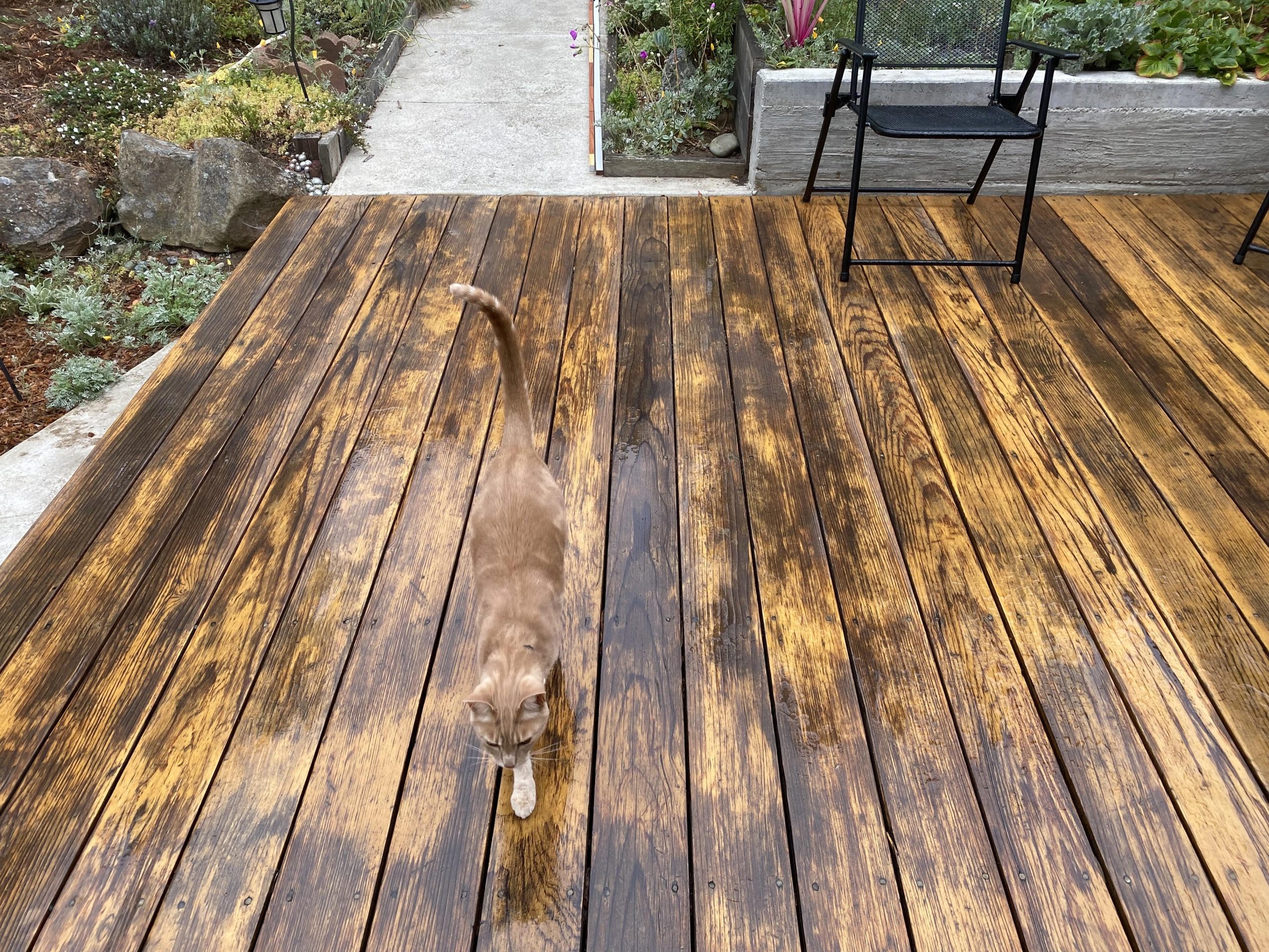I have an 8 X 20 cedar deck, built in 2016, in the Seattle area. It has wood – presumably cedar or possibly hemlock – railings too. The contractor used an eco-friendly, plant-based stain called TimberPro Coatings (Portland, OR). He also used it on a privacy fence. It looks good and has held up well in general, with the exception of decking exposed to sun and rain, which cracks and flakes. Covered decking has held up, as has the railings and fence, but the exposed decking is driving me mad. I repair it every summer but it starts to fail again in about six months. I finally decided to take another route. Stripped the Timber Pro stain with their stripper last fall, but couldn’t get it all off. Now I am back at it. I got Defy stripper to try this time. I was going to use Ready Seal, thinking it wouldn’t crack or flake, but there are other negatives. Also considering Defy. But thinking an oil-based product would be less prone to cracking again? Can I strip with Defy stripper and stain with TWP? Or would it be best to follow Defy stripper with Defy stain?