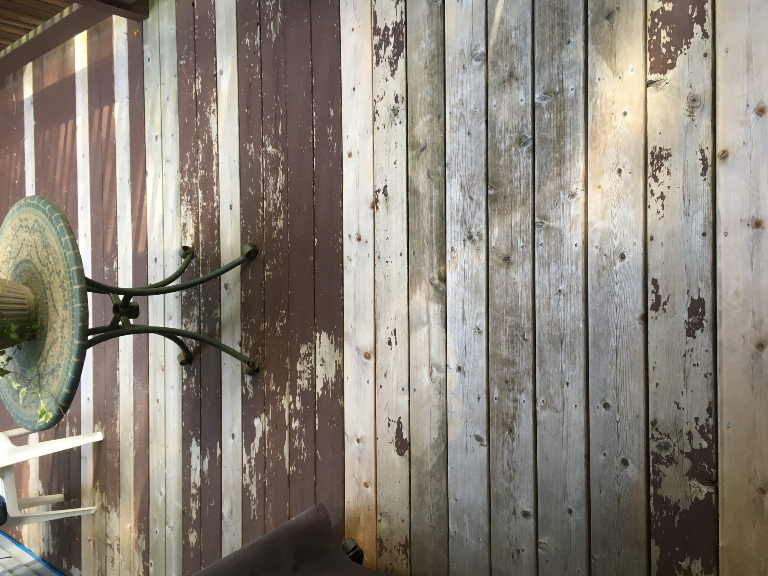 The wood is weathered and existing stain, as it is, is peeling, cracking and in tiny little grooves in the wood.